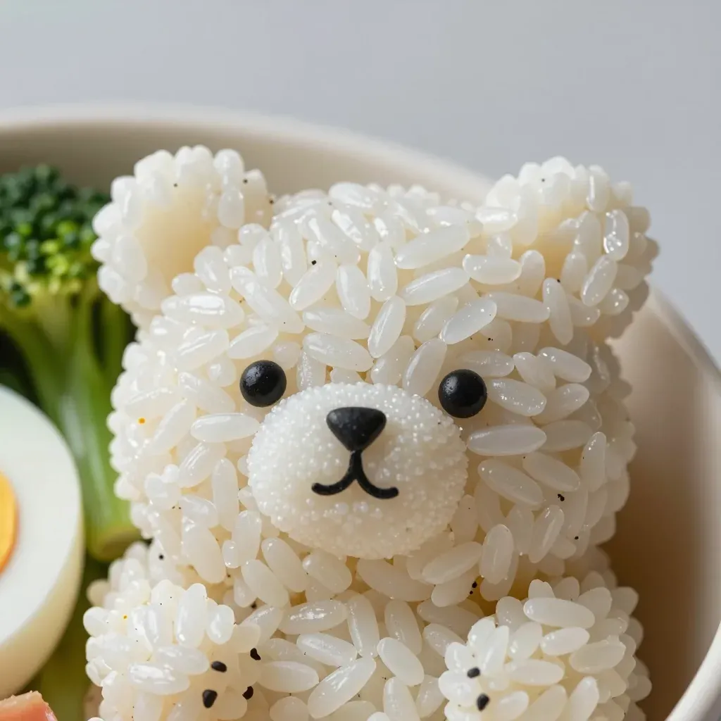 A close-up of a rice bear bento with soft, glossy rice grains and black sesame seeds forming its face, set against a blurred background of broccoli and a soft-boiled egg, highlighting the texture and details of the rice under soft, diffused lighting.