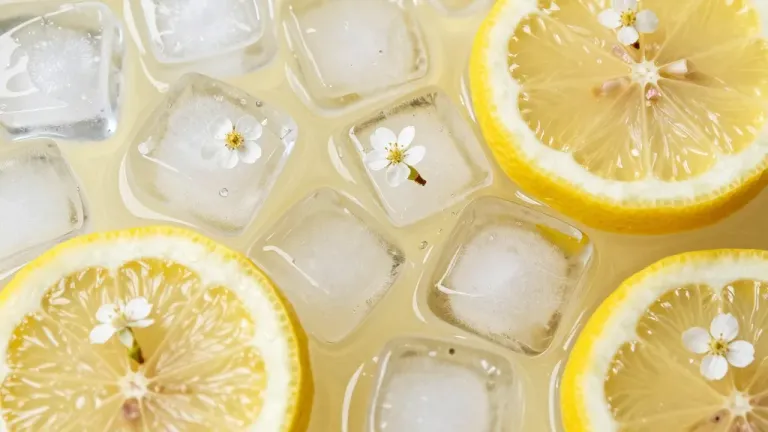 Close-up of ice cubes with white flowers and a lemon slice, illuminated by diffused, soft light that highlights textures and colors. The shallow depth of field and blurred background emphasize the subject, creating a clean and focused composition.