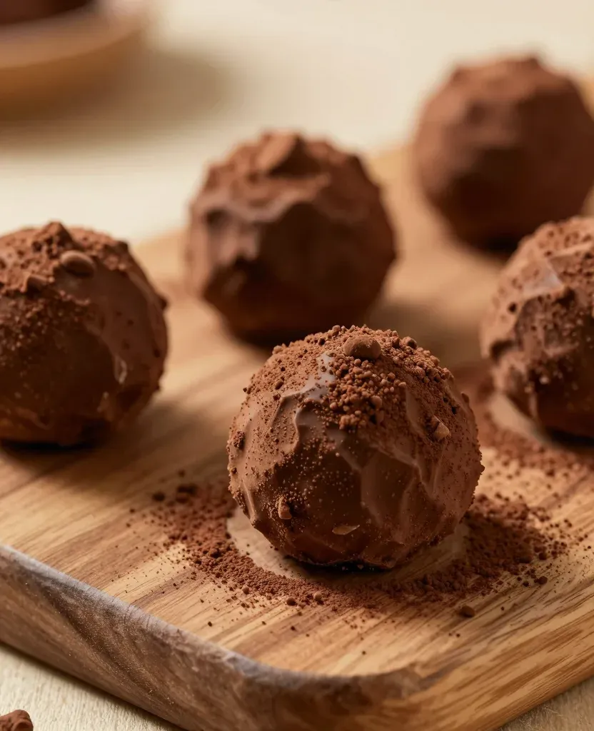 A horizontal row of glossy chocolate truffles dusted with cocoa powder, softly lit from above, creating gentle shadows and highlights. The shallow depth of field keeps the focus on the truffles, with a blurred wooden surface and neutral beige backdrop.