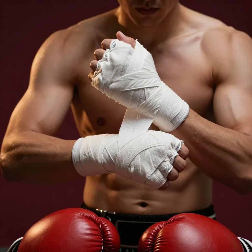 A muscular boxer stands shirtless, wrapping his hands with white boxing tape, showcasing his defined muscles and glossy sweat. The directional lighting highlights the texture of the tape and the subject's physique, creating deep shadows and emphasizing the intensity of the moment.