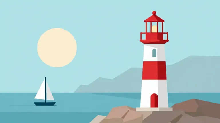 A serene sunset scene featuring a red lighthouse perched on a rocky outcrop, with a sailboat in the calm sea. The soft, diffused light enhances the tranquil atmosphere, creating gentle shadows and highlights on the lighthouse and rocks.