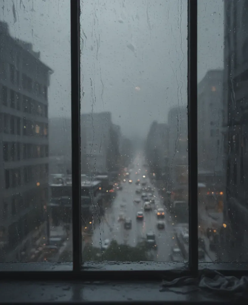 Raindrops streak down a wet window, reflecting the soft glow of city lights, creating a hazy, muted atmosphere. The blurred cityscape in the background emphasizes the depth and texture of the rain and window frame.
