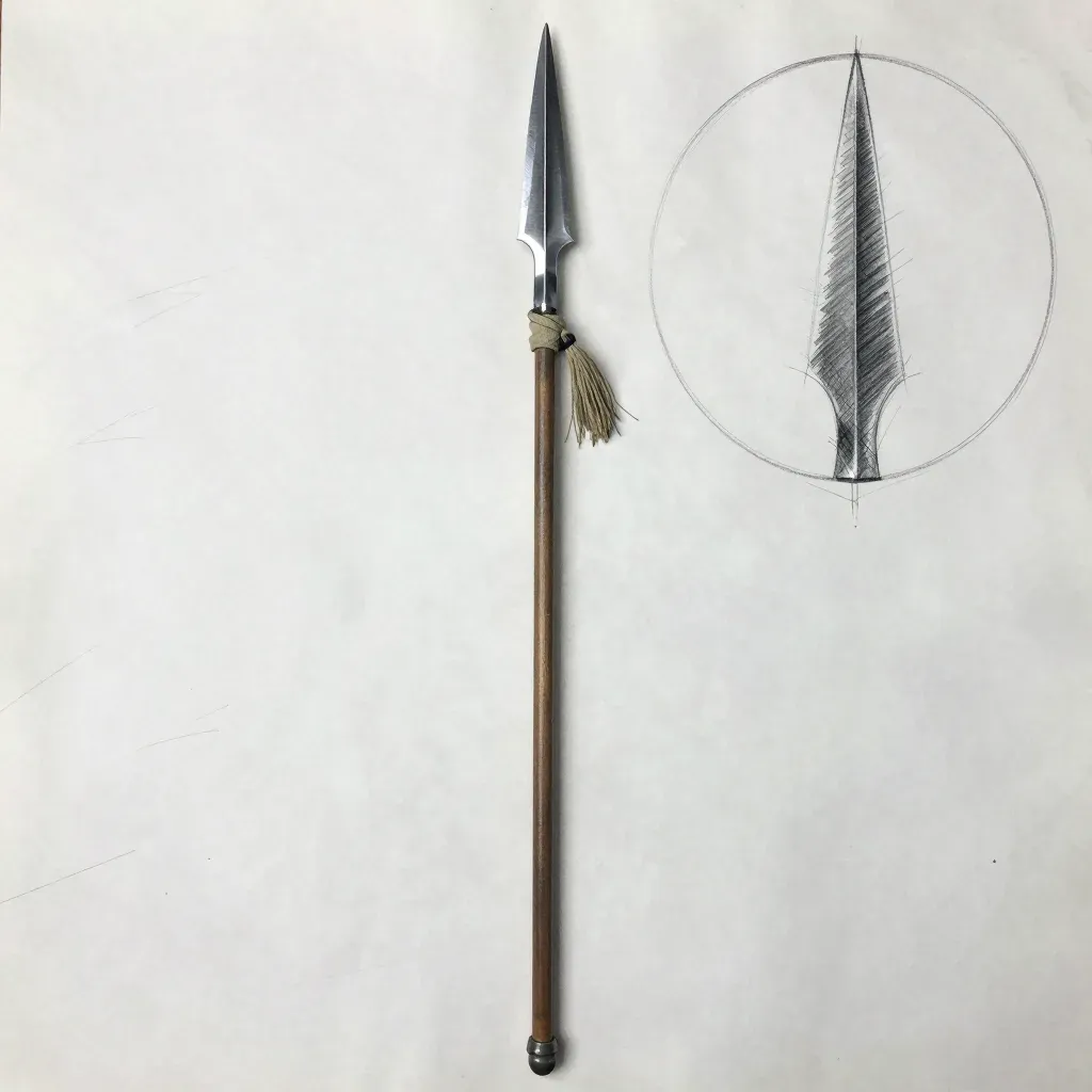 A close-up of a crescent-shaped spearhead with a wooden shaft and a soft tassel, highlighted by soft, diffused lighting that accentuates the spearhead's curves and the wood's texture. The plain white background ensures the focus remains on the intricate details of the spearhead.