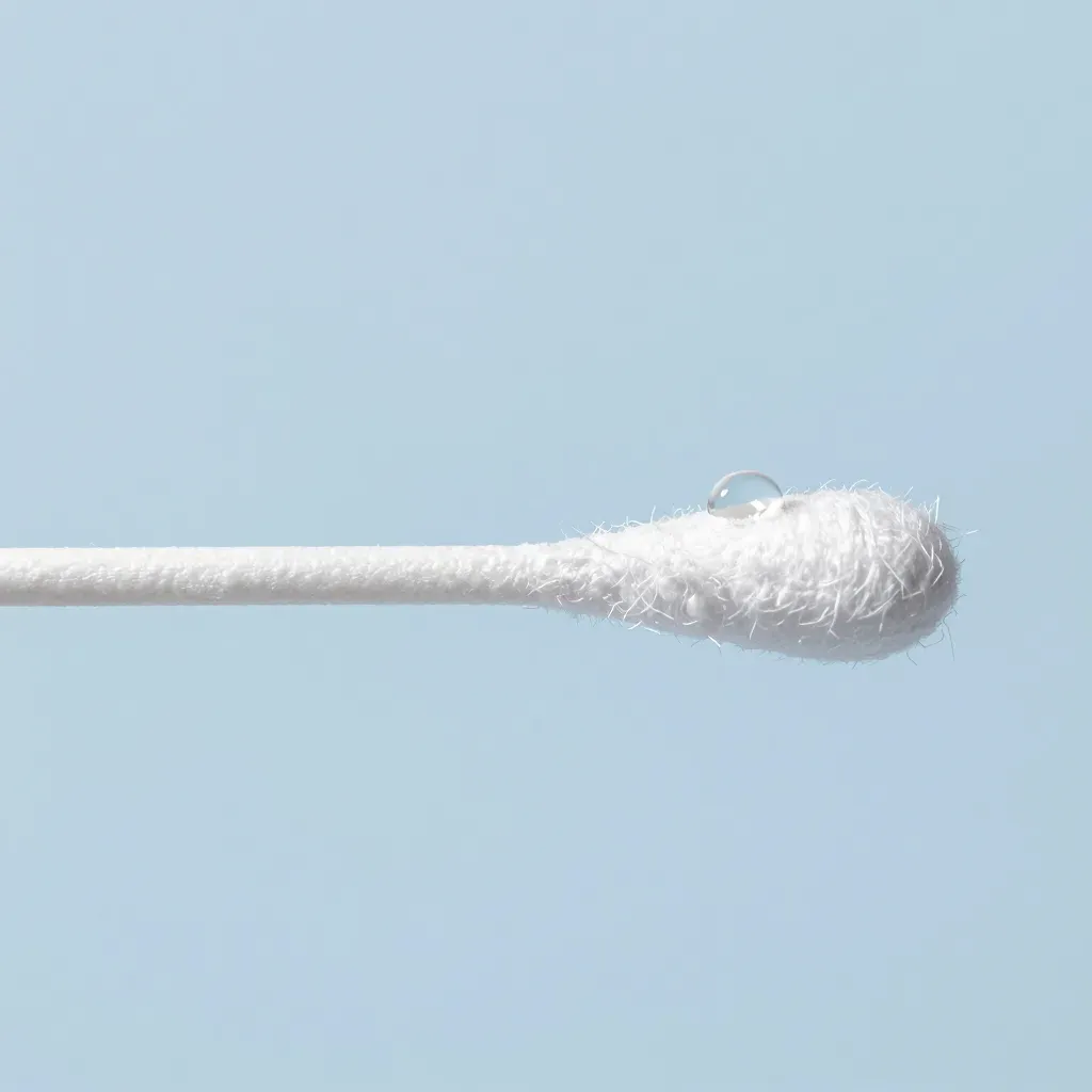 A dense, fluffy white cotton swab extends from the left, with a gel bead at its tip, set against a soft, diffused light and pale blue background. The composition creates a sense of depth and minimalism, ideal for clean, medical, or cosmetic product imagery.