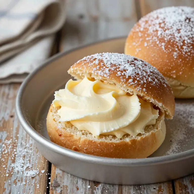 A close-up of a golden brioche bun filled with creamy custard, highlighted by soft natural light that accentuates the glossy texture and golden hue. The shallow depth of field and rustic wooden background provide a clean, focused composition ideal for culinary and food photography.