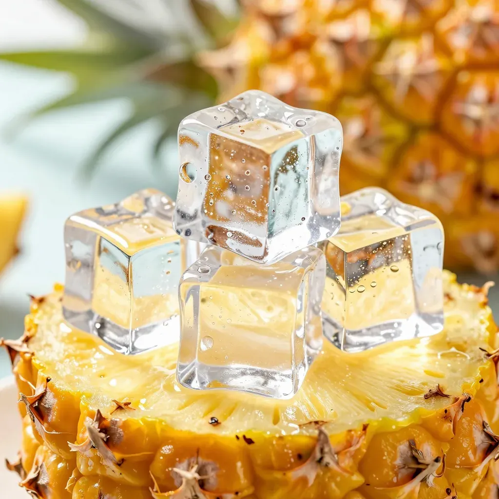 A pyramid of ice cubes sits atop a vibrant pineapple, with soft, diffused light highlighting the textures and colors. The shallow depth of field blurs the tropical background, emphasizing the fresh and refreshing composition.