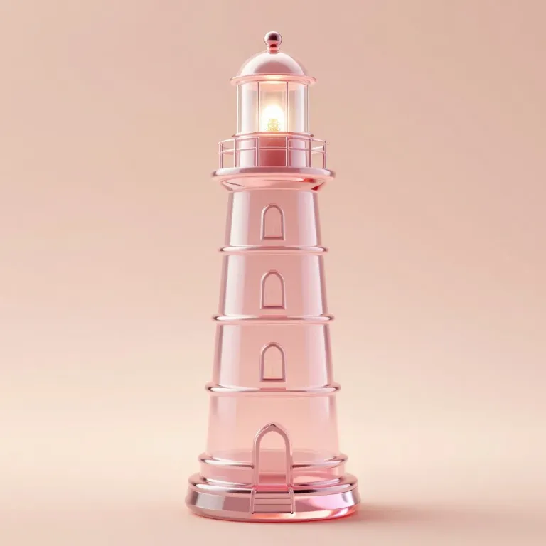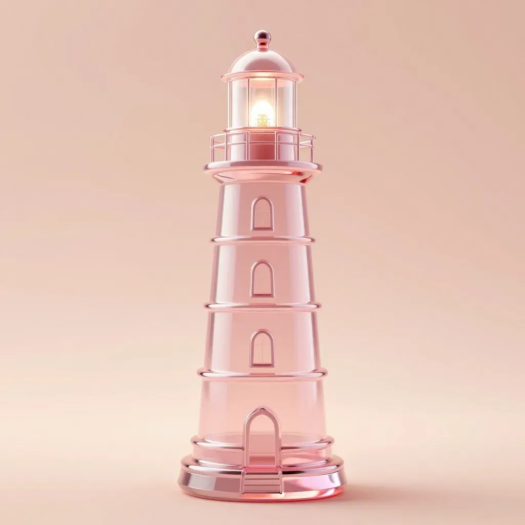 A translucent glass lighthouse with a glowing lantern casts a soft, warm glow, creating reflections and a serene atmosphere. The lighthouse is centered against a blurred, warm beige gradient background, emphasizing its height and elegance.