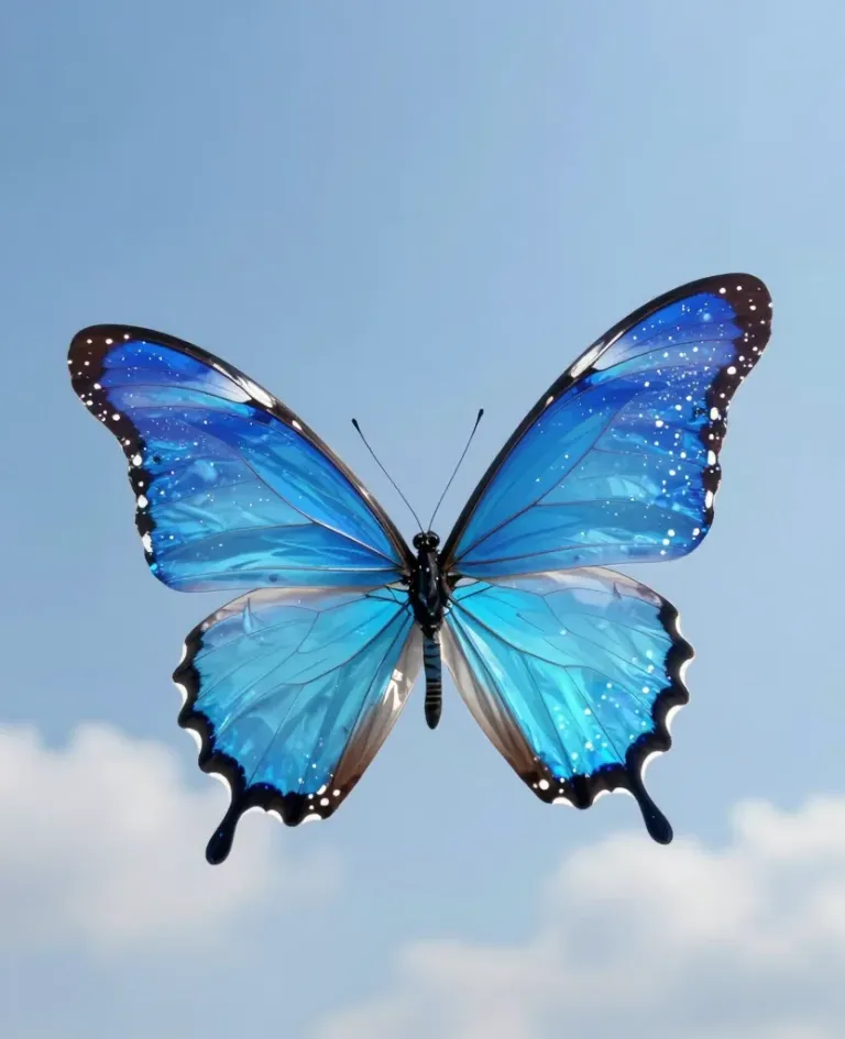 A translucent, glossy Aqua-Crystal Butterfly with a subtle sparkle and sleek black body, set against a pale blue sky with soft, white clouds, slightly blurred to emphasize the butterfly. The soft, diffused light highlights the butterfly's wings and body, creating a serene and ethereal atmosphere.