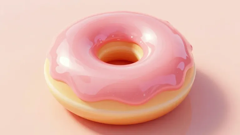 A close-up of a pink donut ring with cascading icing, illuminated by soft, diffused light that enhances its glossy texture and vibrant color. The blurred pale peach background ensures the focus remains on the donut's inviting appearance.