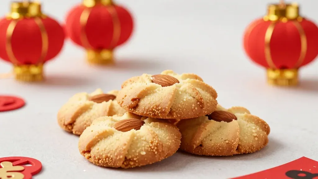 A close-up of golden-brown almond cookies piled in a mound, highlighting their crumbly texture and crunchy almonds under soft, warm lighting. The shallow depth of field blurs the festive red lanterns in the background, creating a focused and inviting composition.