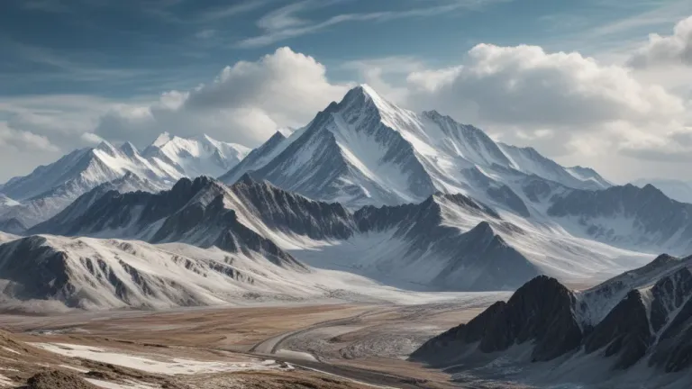 A serene landscape featuring snow-capped mountain peaks bathed in soft, diffused light, with a rugged, rocky foreground leading the eye towards the majestic snow-covered summits. The expansive sky with scattered clouds adds depth and context to the mountain range.