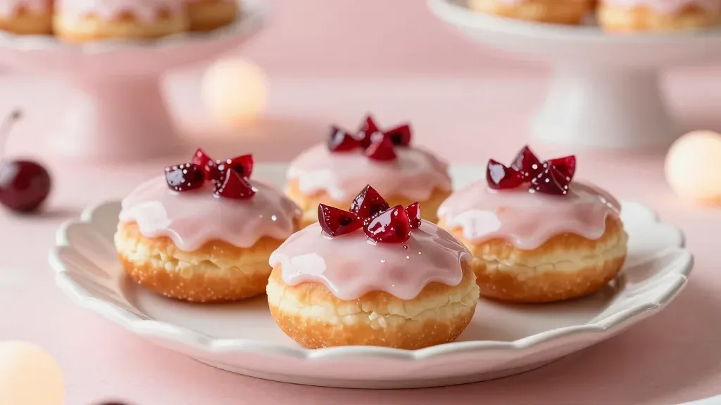 Soft, fluffy donuts with glossy pink icing and powdered sugar, garnished with cherries, set against a soft pink background. The shallow depth of field and warm lighting create a cozy, inviting atmosphere.
