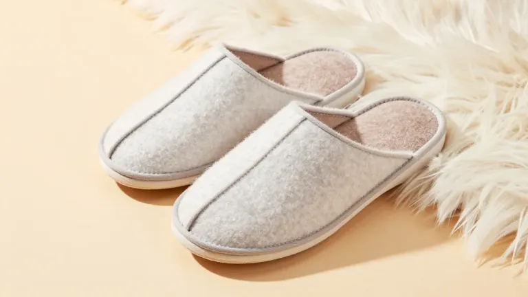 Soft, fuzzy felt slippers with an open-toe design rest on a cream-colored fur rug, creating a luxurious and cozy atmosphere. The diffused, soft lighting highlights the texture of the slippers and rug, emphasizing their plushness and comfort.