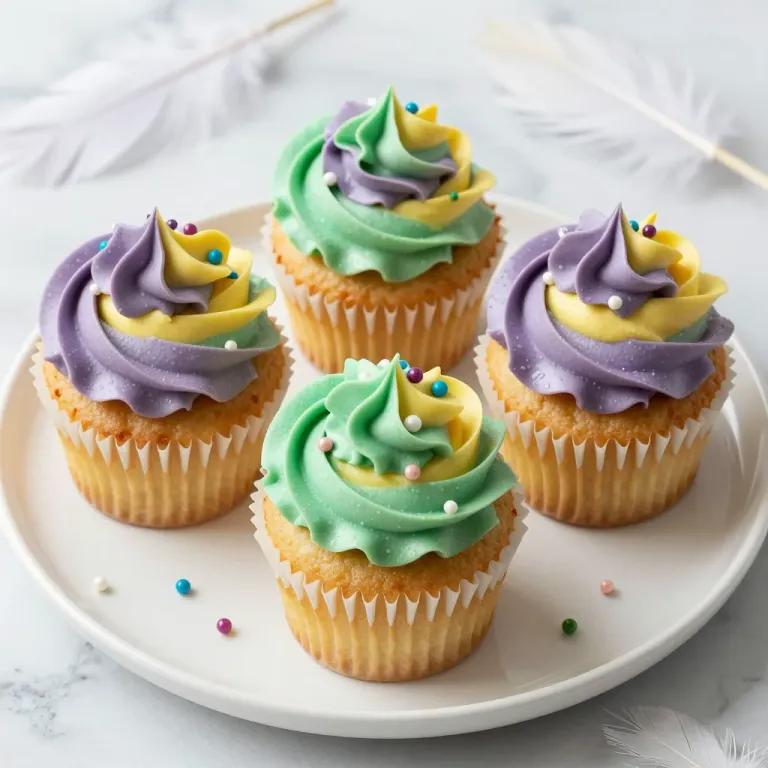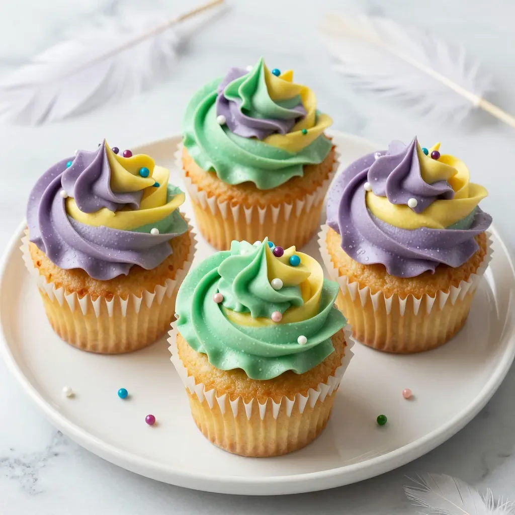 Four cupcakes with swirled frosting and candy sprinkles are arranged on a white plate, bathed in soft, diffused light that highlights the glossy texture of the frosting and creates a shallow depth of field. The neutral marble background and blurred feathers add a clean and elegant backdrop, ideal for culinary and food photography.