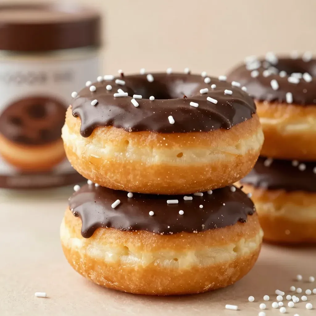 A stack of chocolate-dipped donuts with delicate white sprinkles, showcasing a glossy chocolate sauce and a soft donut crust under soft, diffused lighting that creates gentle highlights and shadows. The shallow depth of field and light beige background provide a clean and focused composition.