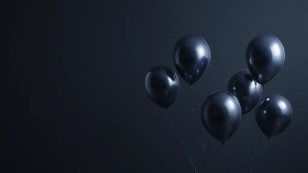 A cluster of metallic balloons in deep sapphire blue, reflecting light and creating highlights, set against a dark, almost black background. The composition is balanced, with the balloons centered, providing a stark contrast and ample copy space.