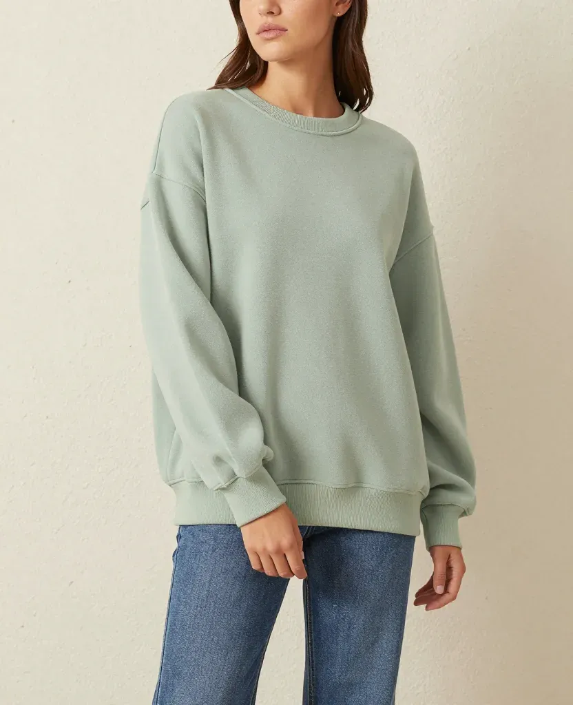 A model showcases a loose-fitting, sage green sweatshirt with soft, plush fabric, paired with blue jeans, under diffused, soft lighting that highlights the relaxed fit and subtle texture. The neutral, light beige background slightly blurs to emphasize the subject, creating a clean and focused composition.