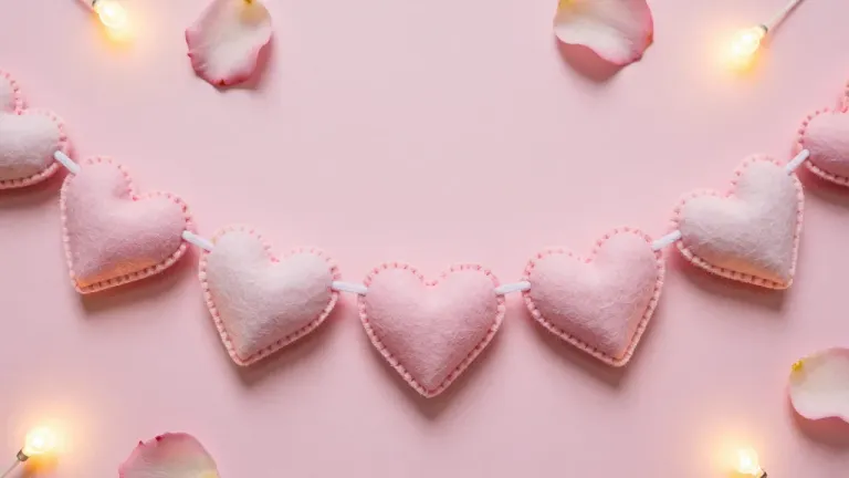 A soft pink felt heart garland with hand-stitched edges is arranged in a horizontal line, surrounded by scattered rose petals and glowing fairy lights. The flat lay composition features warm, diffused lighting with bokeh highlights, set against a clean matte pink background providing ample copy space.