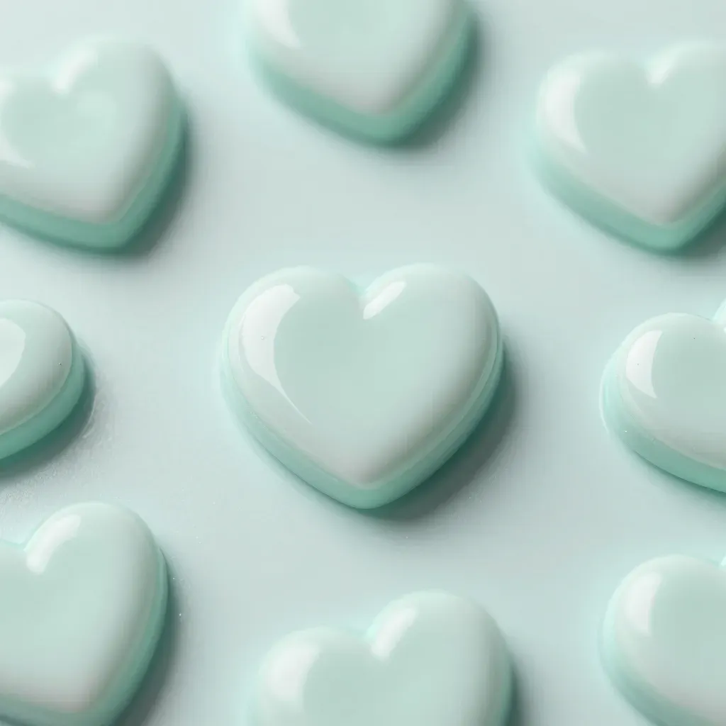 Heart-shaped candy plaques with a smooth, glossy, marshmallow-like surface are arranged in a scattered grid, casting soft shadows under diffused overhead lighting. The shallow depth of field emphasizes the central heart while the uniform gray-blue background provides clean, uncluttered copy space.