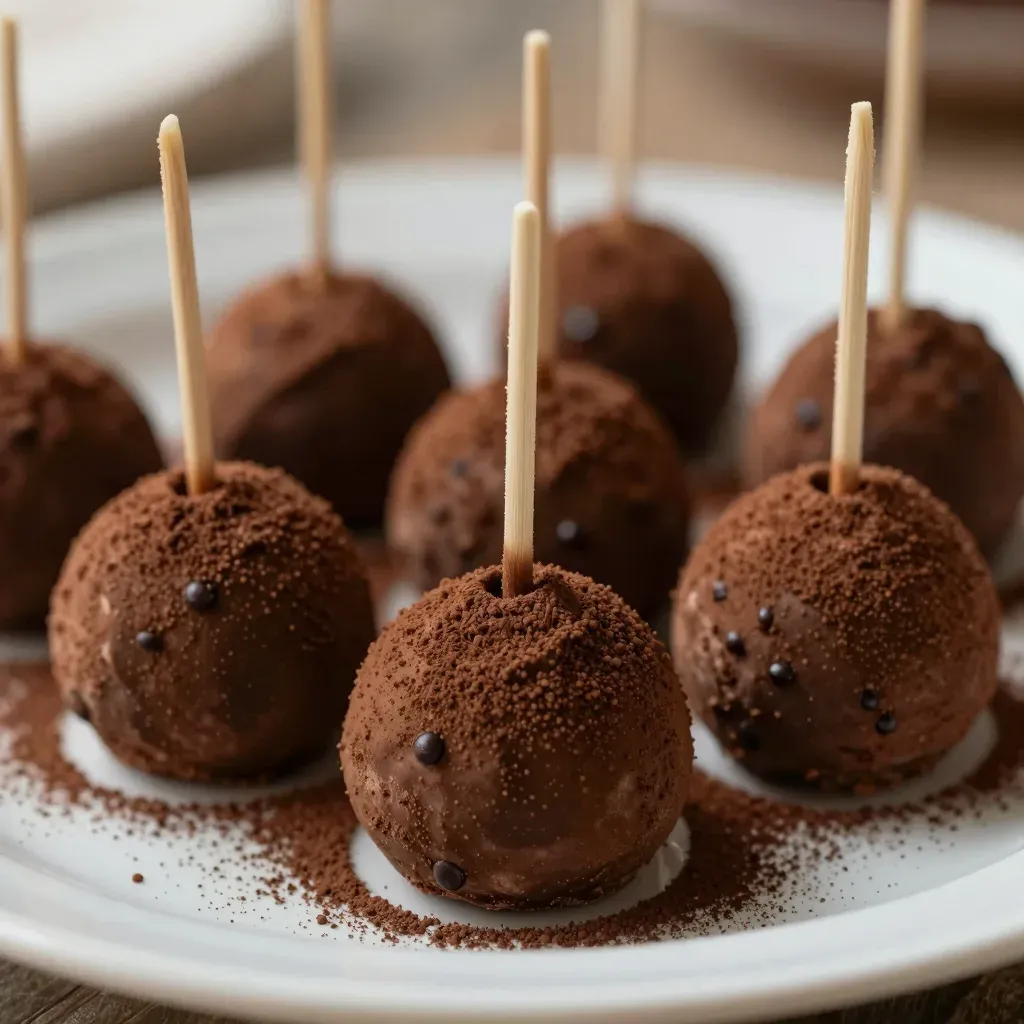 Smooth, glossy chocolate truffles dusted with cocoa powder are skewered and arranged on a white plate, illuminated by warm, directional light that highlights their texture and creates a shallow depth of field, focusing on the truffles.
