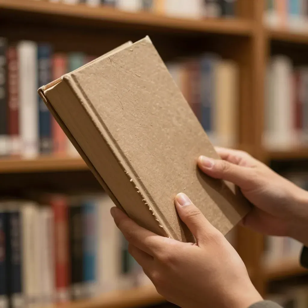 A close-up of hands gently holding a rough, brown book, with warm ambient light filtering through bookshelves, creating a soft, inviting glow. The shallow depth of field blurs the background, emphasizing the hands and book.