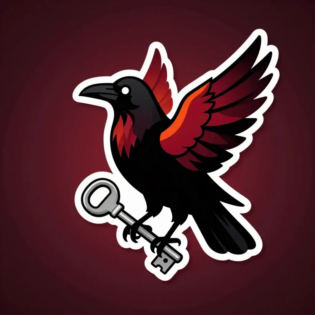 A glossy black raven with vibrant red and orange accents spreads its wings wide against a deep red background, illuminated by warm light that enhances its features. The smooth, blurred background emphasizes the raven as the focal point, creating a dramatic and balanced composition.