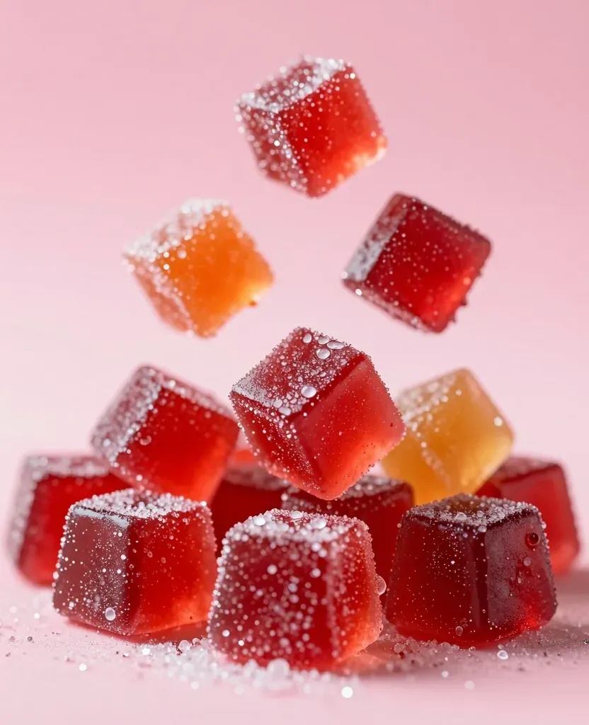 #jelly cubes#cherry red#amber#sugar crystals#translucent#diffused lighting#falling#food photography#sweet#snack