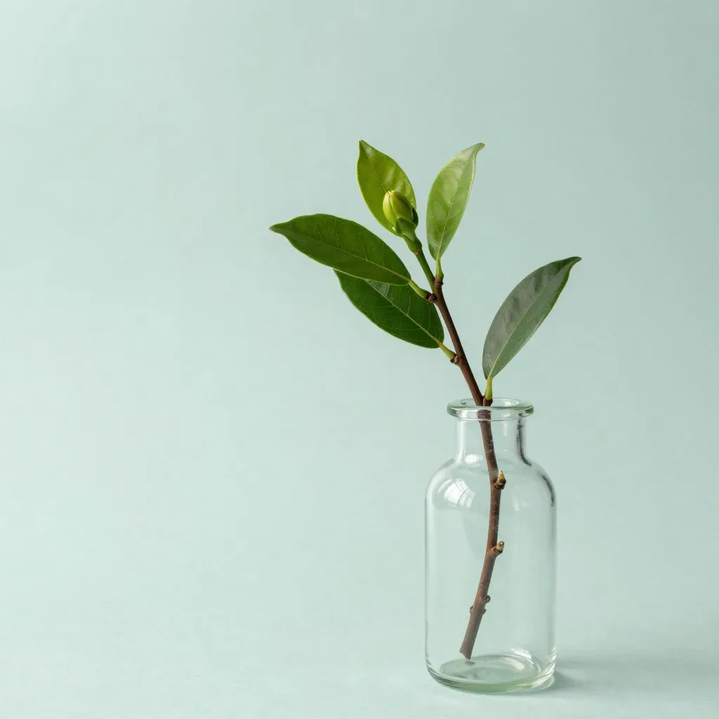 A sprig of glossy green leaves and a budding flower is displayed in a clear glass bottle, softly lit by diffused light that creates a gentle glow and subtle shadows. The minimalistic pale blue background, slightly blurred to emphasize the subject, provides a clean and serene setting.