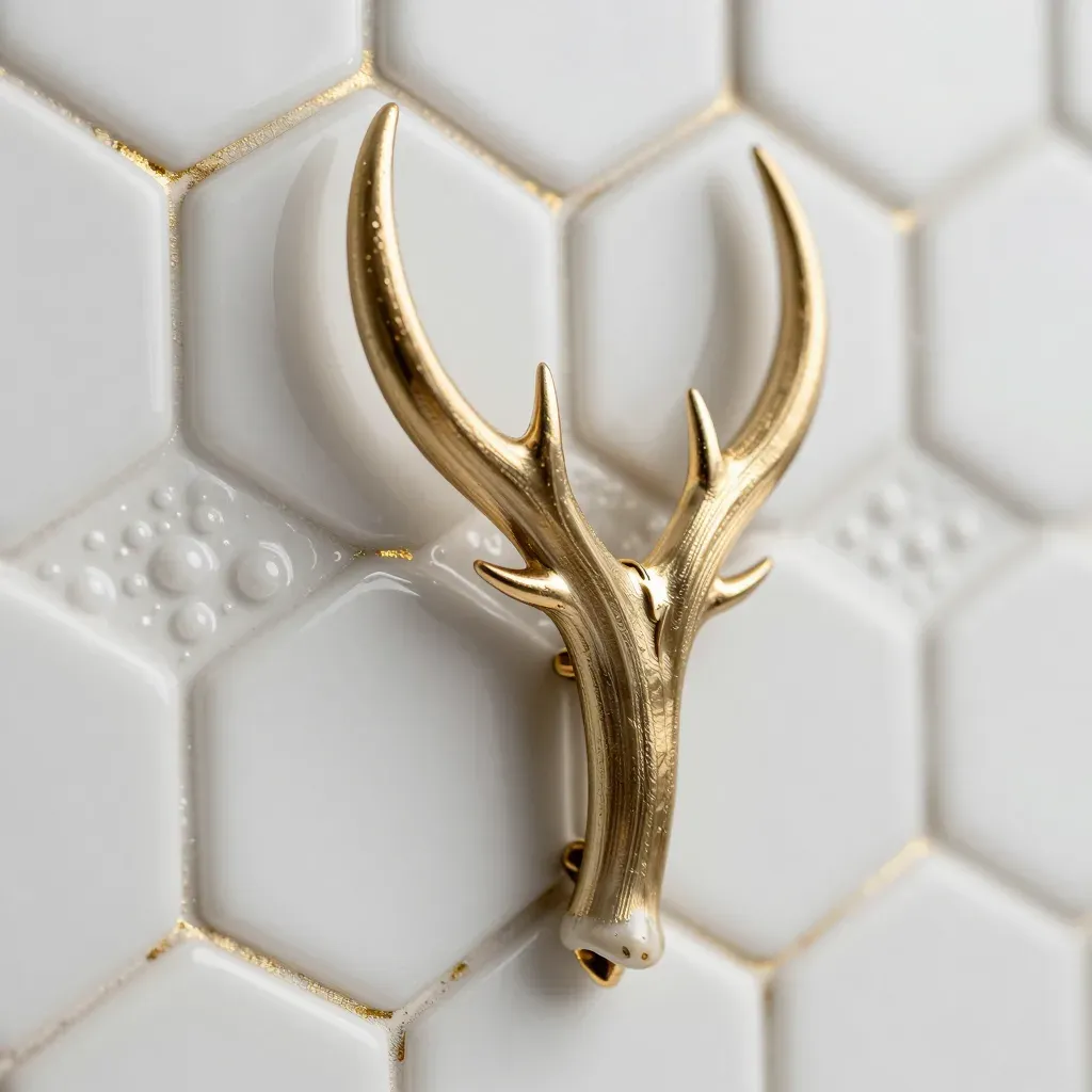 A close-up of a polished gold antler brooch set against a backdrop of white hexagonal tiles with raised dots, softly lit to highlight the brooch's reflective surface and create gentle shadows.