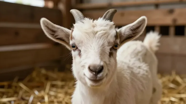 A close-up of a white goat with perked ears and wide eyes, nuzzling its nose, set against a soft, diffused light that highlights its glossy fur and creates gentle shadows. The background, slightly blurred, features a wooden barn structure, golden hay, and a hint of another goat, adding depth and context to the scene.