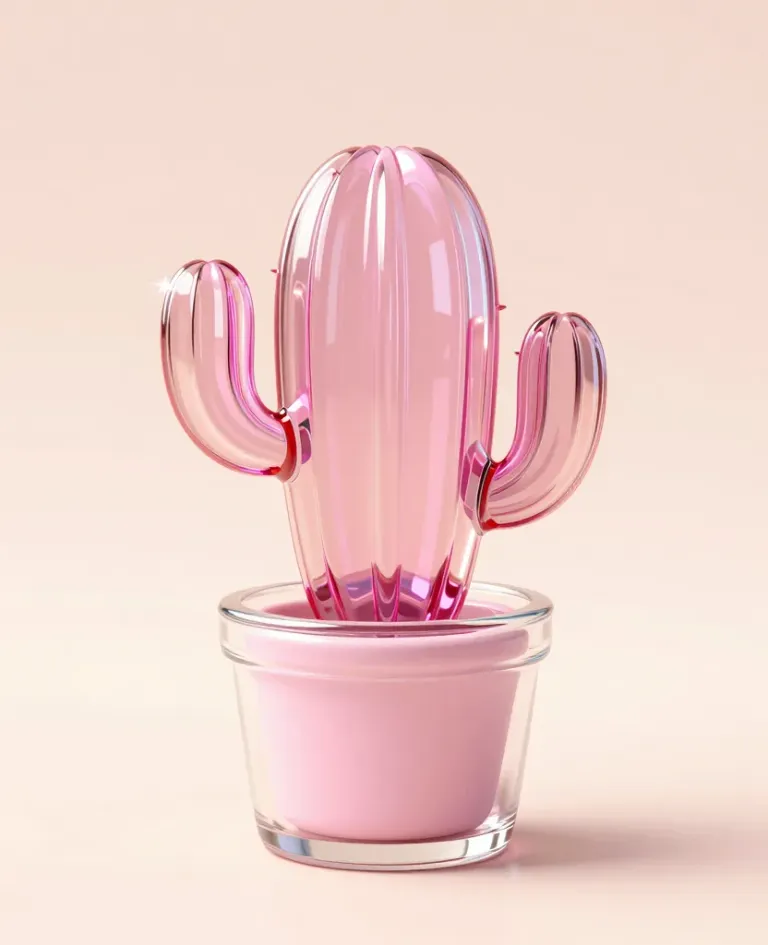 A crystal-clear pink cactus with glossy, smooth surfaces stands in a glass pot, illuminated by soft, diffused lighting that creates highlights and reflections. The blurred, light pink background enhances the subject, providing a clean and minimalistic backdrop.