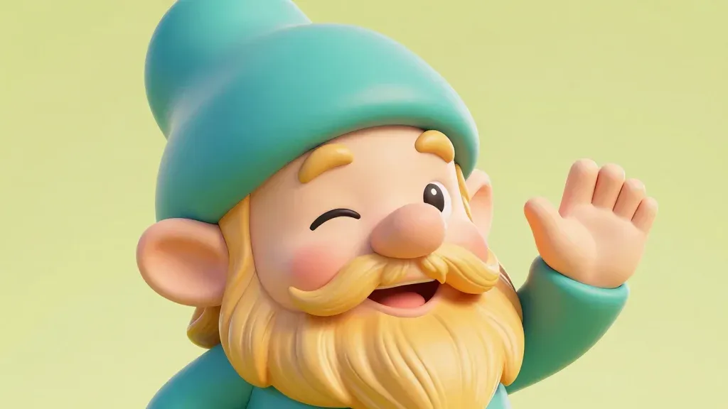 A close-up of a garden gnome with a blue hat and golden beard, winking playfully. Soft, diffused lighting highlights the glossy texture of the hat and the fluffy beard, set against a pastel yellow background that slightly blurs the focus on the gnome.