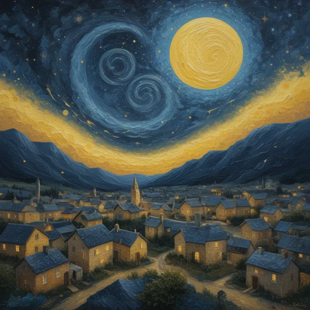 A quaint village with stone and slate rooftops bathed in the warm, golden light of the setting sun, creating a serene and picturesque scene. The composition leads the eye from the village to the dark, mountainous background, emphasizing depth and tranquility.