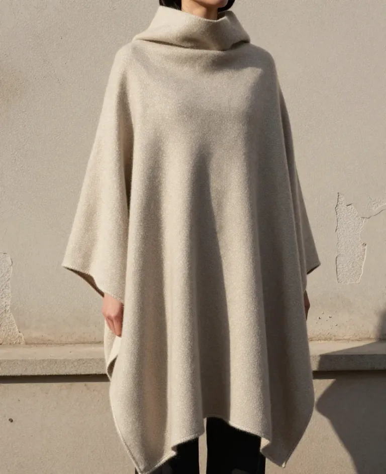 A person stands in a cream-colored poncho, casting dramatic shadows against a textured wall. The side lighting highlights the soft, fuzzy fabric and high collar, creating a minimalist and elegant composition.