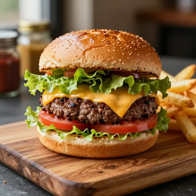 A juicy beef burger with a toasted sesame seed bun, melted cheese, crisp lettuce, and tomato slice, presented on a rustic wooden board. Soft directional lighting from the upper left highlights the glossy bun and gooey cheese, while a shallow depth of field blurs the background fries and condiment jars, emphasizing the burger as the focal point.