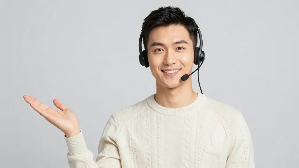 A young man in a cream cable-knit sweater and black headset gestures with his hands, engaging directly with the viewer. The soft, even lighting highlights his features against a clean, light gray background, creating a professional and approachable atmosphere.