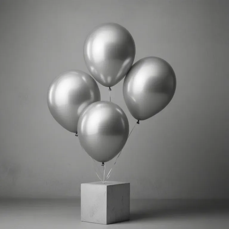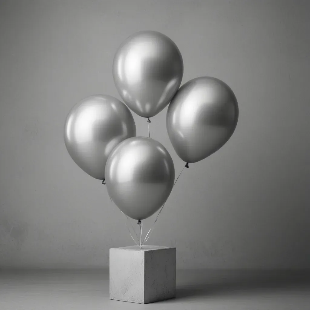 Four glossy, reflective metallic silver balloons are tied together and rest on a rough, concrete pedestal. Soft, diffused light highlights the balloons, creating a clean and minimalistic backdrop.