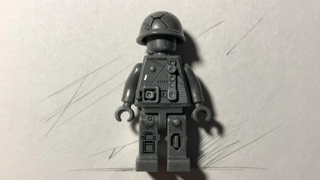 A matte gray LEGO minifigure in military-style armor stands upright, its helmet and stud details visible under directional lighting that casts a hard shadow to the lower right. The tight, centered composition with shallow depth of field and faint pencil sketch lines in the background suggests a conceptual or symbolic context.