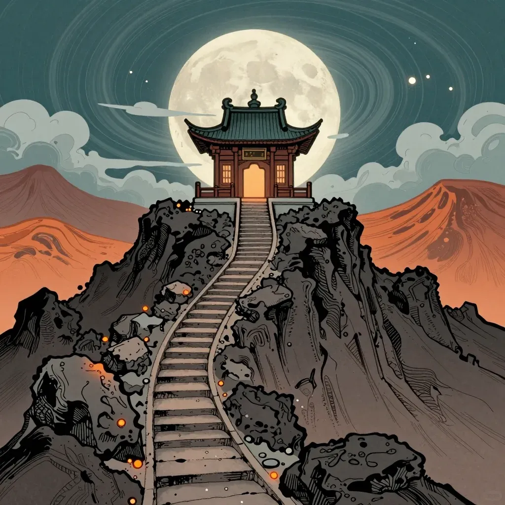 A serene temple staircase is illuminated by warm lanterns against the backdrop of a full moon and volcanic landscape. The composition draws the viewer's eye up the winding steps, creating a sense of depth and leading to the central focus of the temple. The soft glow of the moon and the warm lanterns highlight the rough, jagged rocks and smooth stone steps, adding to the ethereal atmosphere.