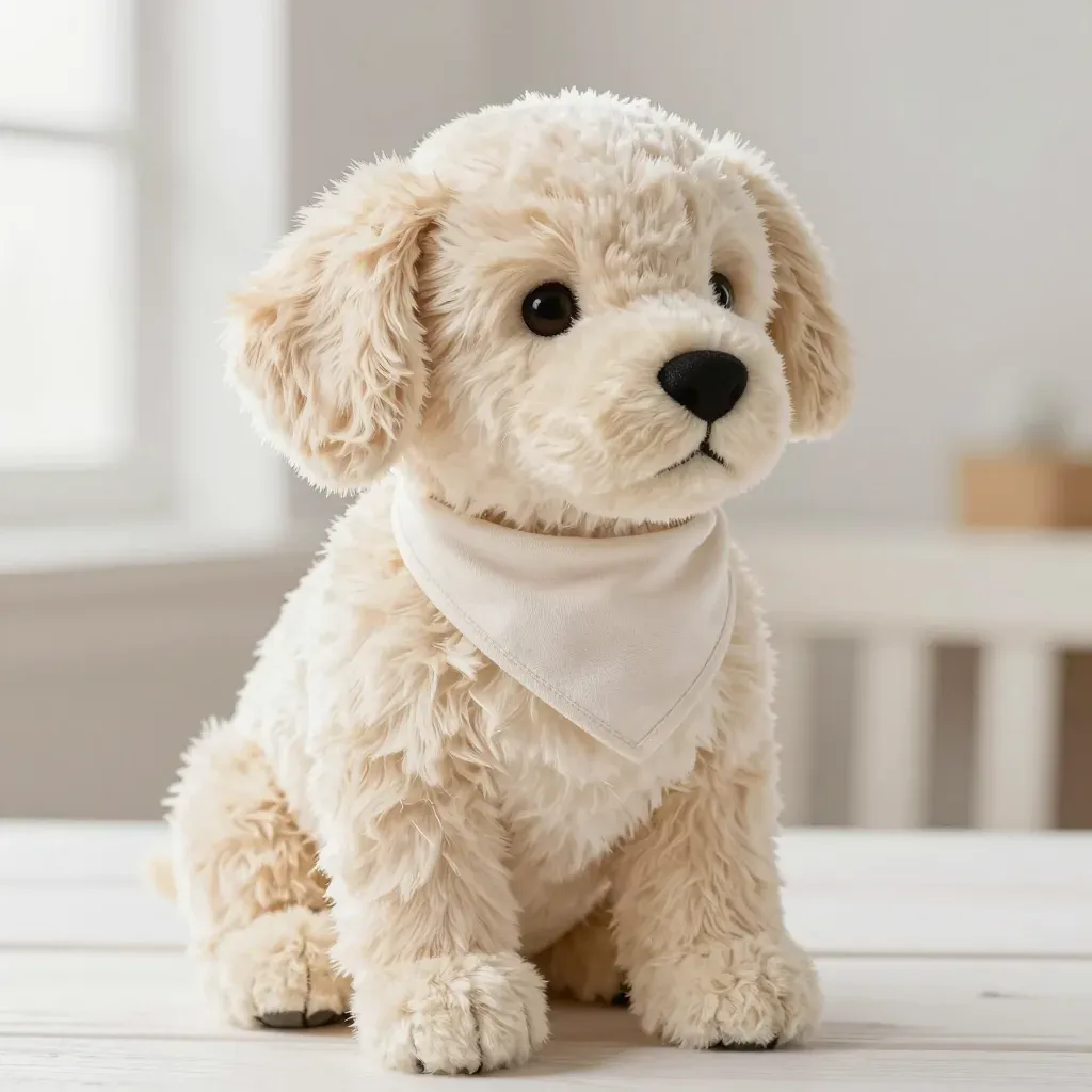 A soft, cream-colored plush dog with a white bandana sits on a white bench, bathed in soft, diffused natural light. The shallow depth of field and centered composition create a clean, minimalist aesthetic.