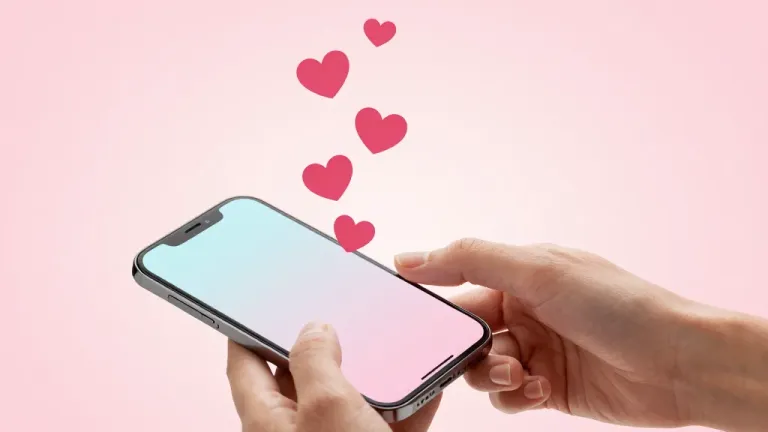 Two hands gracefully swipe smartphones, with hearts floating upwards, set against a soft pink gradient background. The warm, diffused lighting and shallow depth of field create a romantic and intimate atmosphere, ideal for valentine's day or relationship-themed content.