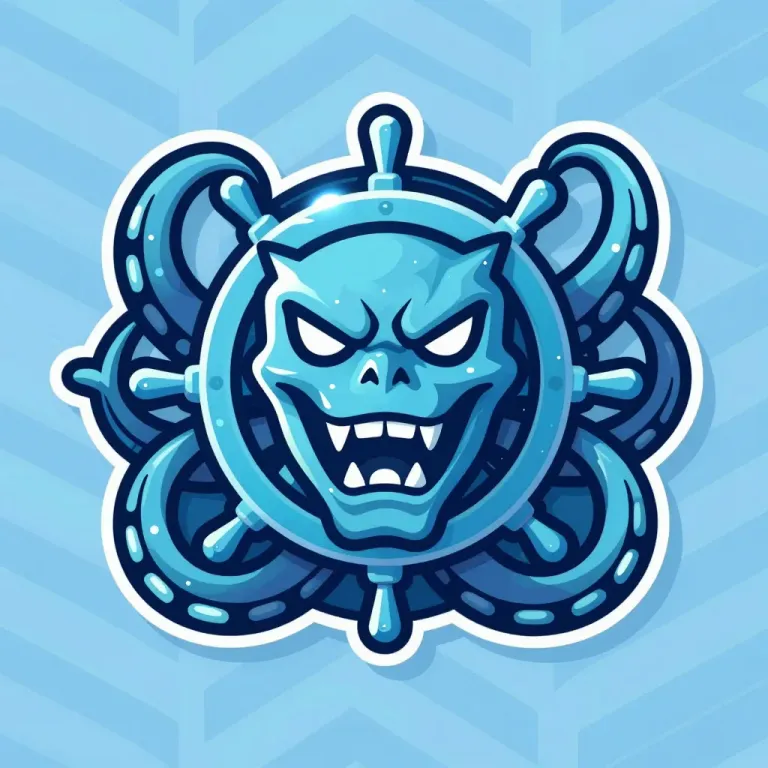 A fierce ice-blue kraken with coiled tentacles around a ship's helm, illuminated by directional light from above, creating highlights on the tentacles and the helm, with soft shadows on the background. The kraken is centered, with the helm and tentacles framing the face, creating a strong focal point against a light blue zigzag background.