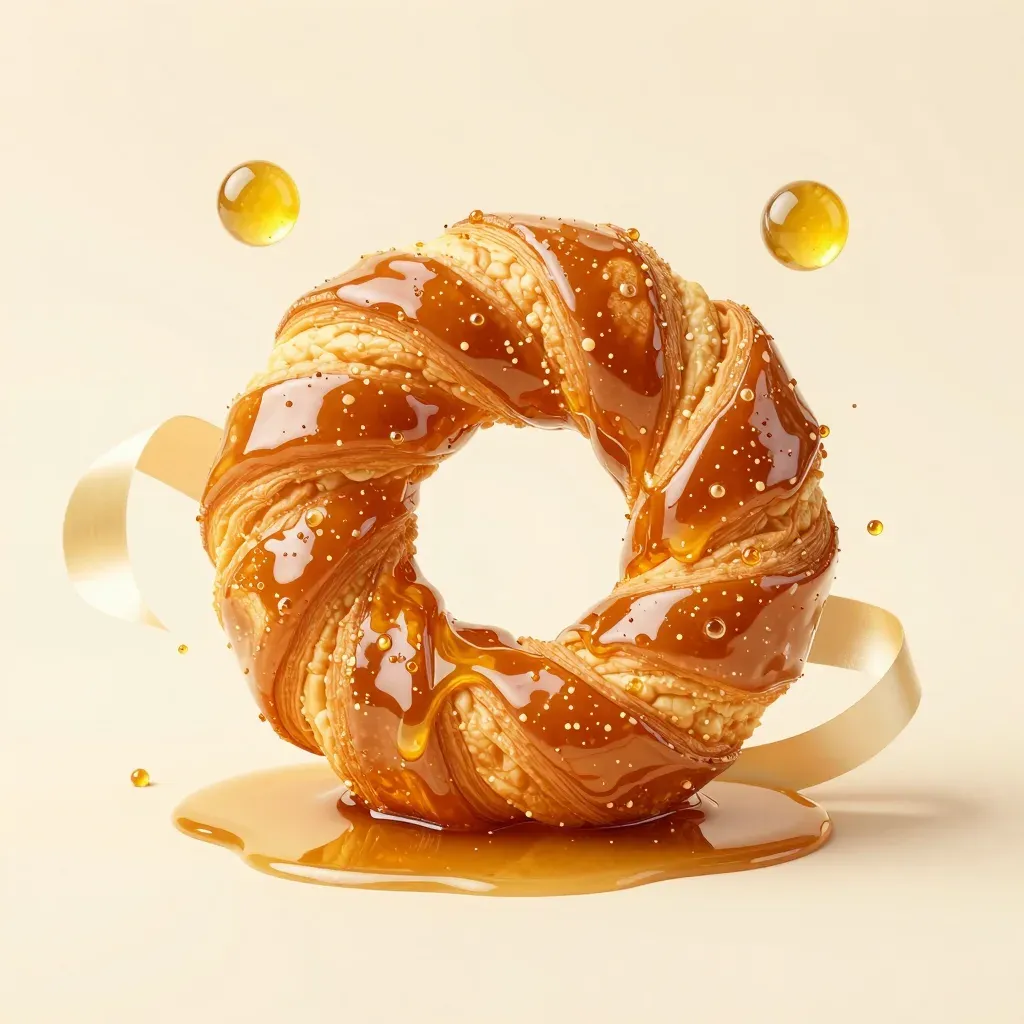 A close-up of a cruller coated in glossy caramel glaze, with golden droplets accentuating its flaky layers and glossy surface. The diffused, warm lighting highlights the texture and depth, creating a shallow depth of field that draws attention to the cruller against a neutral, blurred background.