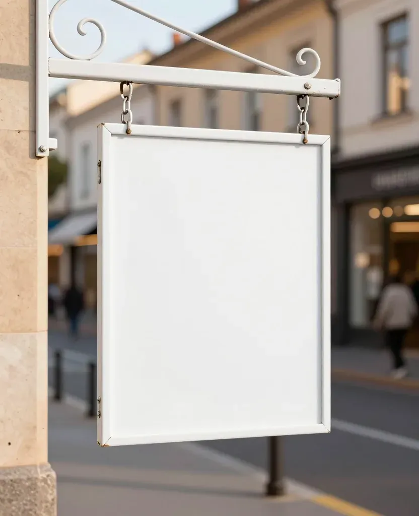 A smooth, glossy white sign hangs prominently against a backdrop of soft, golden sunlight and muted urban tones. The blurred street scene with people and storefronts in the background suggests a lively urban environment with ample copy space for text.