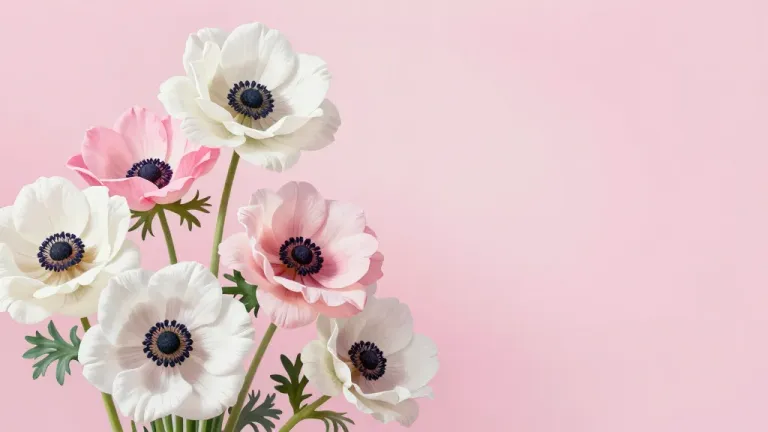 A cluster of anemones with velvety white and light pink petals and glossy dark centers, softly lit from above, creating gentle shadows and highlights. The clean, pastel pink background provides a simple and elegant backdrop, ideal for minimalistic designs.