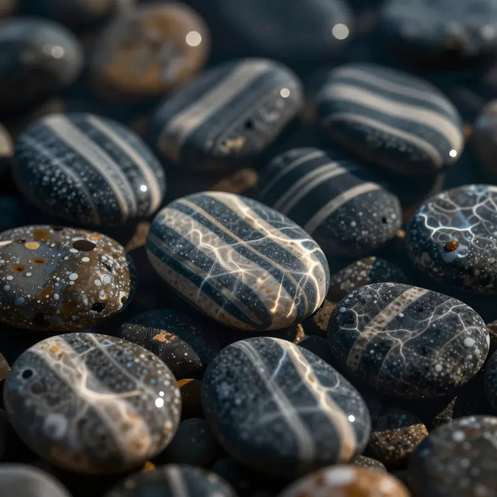 Glossy, striped stones reflect soft, diffused light, creating intricate patterns and highlights. The close-up view emphasizes the detailed textures and subtle roughness where light hits the crevices, set against a blurred, out-of-focus background.