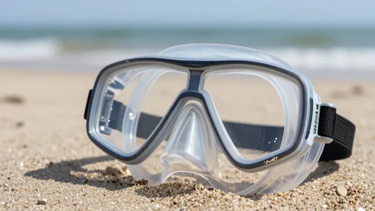 A clear, glossy snorkeling mask with black straps rests on sandy beach under direct sunlight, casting sharp shadows. The shallow depth of field blurs the ocean waves in the background, emphasizing the mask as the focal point.