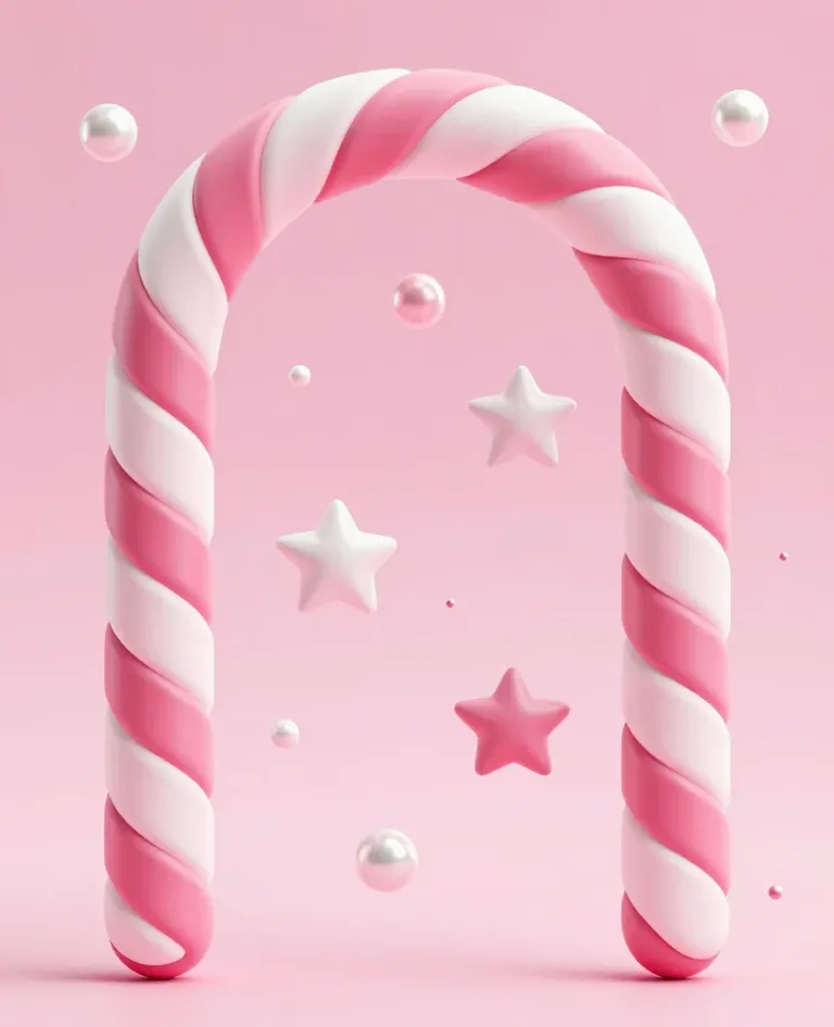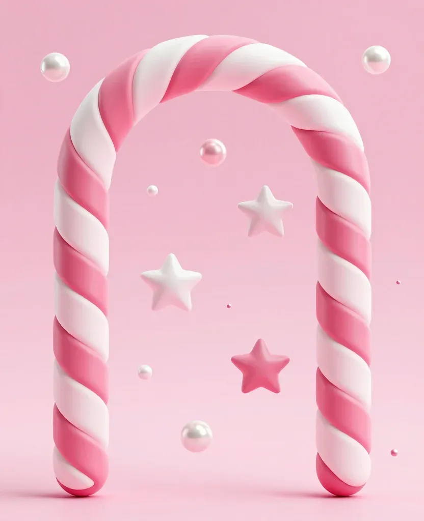 A glossy, twisted candy cane arch adorned with white stars and spheres, set against a soft, diffused light that creates gentle shadows and highlights, providing a clean and whimsical backdrop.