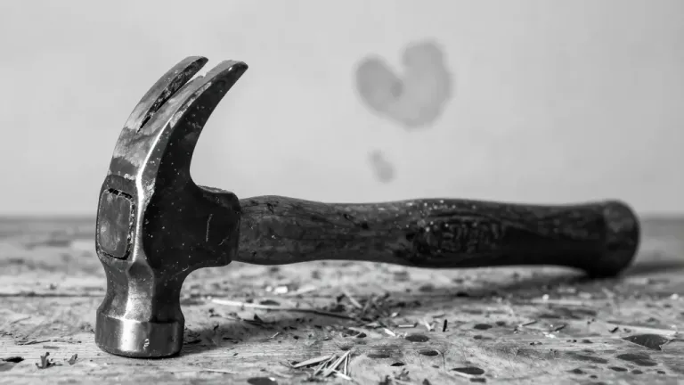 A hammer with a smooth, reflective metal head and a rough, textured wooden handle rests on a wooden surface, bathed in soft, diffused light that highlights its form and creates gentle shadows. The blurred background, suggesting a workshop or creative space, adds depth and context to the scene.