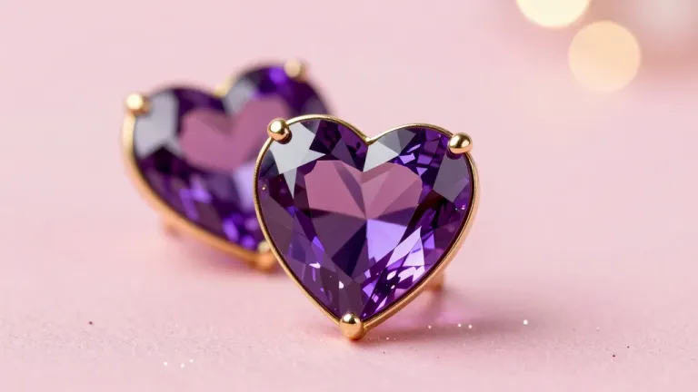 A close-up of a heart-shaped amethyst brooch, its facets catching soft, diffused light, creating a sparkling effect. The shallow depth of field blurs the romantic, soft pink background, emphasizing the brooch's elegance and luxury.